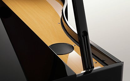 Using the longer prop sets the topboard to the regular, fully-open position, allowing the instrument's sound to project fully for a bright and clear tonal character. However, the shorter prop sets the topboard in a partially closed position, resulting in a darker, more mellow quality.